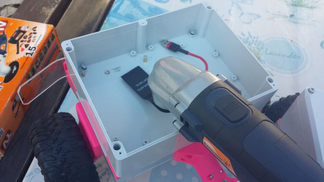 Připomněl bych si také „mučící nástroje”, které byly použity k vytvoření děr (pro STOP tlačítko a dole pro kabeláž):